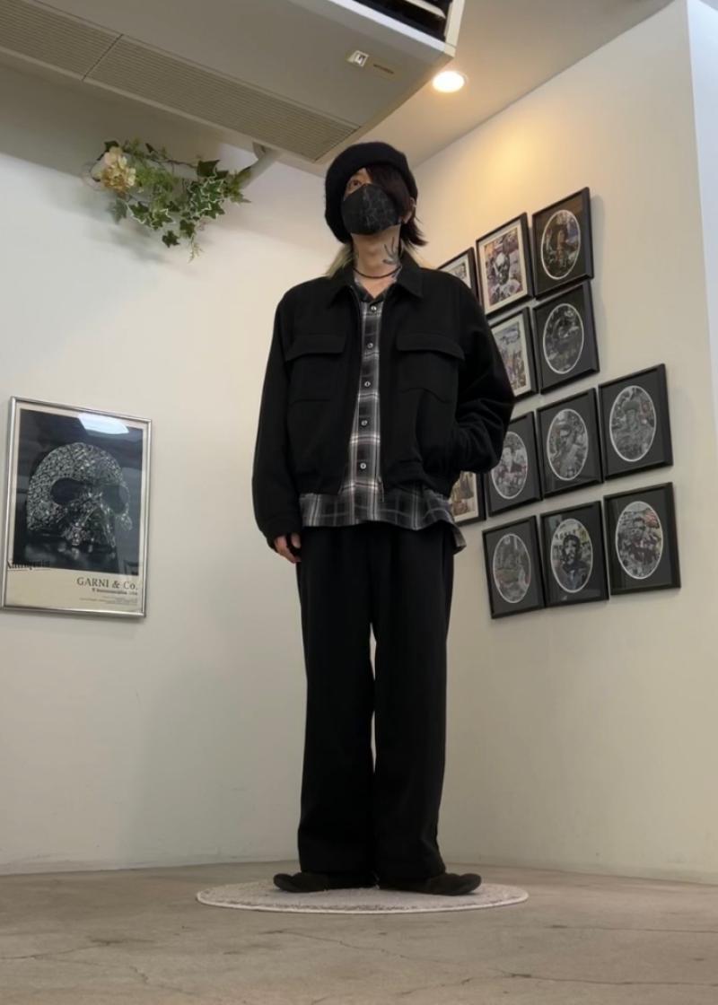 ・ソフトな風合いな圧縮フラノ素材のショートドリズラージャケットとワイドパンツでセットアップ。インナーはオーバーサイズのオンブレチェックシャツでシンプルに。アルパカウールのビッグベレーをアクセントに、足元はルームシューズ1のピッポレザーでヌケ感を演出。 -