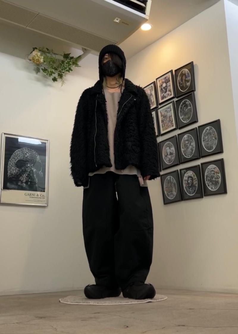 ・スウェット感覚で着用できる圧縮ウールのオーバーサイズプルオーバーにツイスト加工したシャギー素材のライダースを羽織で。ボトムスはハリがありシルエットの出やすいまるみのあるワイドテーパードパンツ。足元はオルカでインパクトをプラス。 -