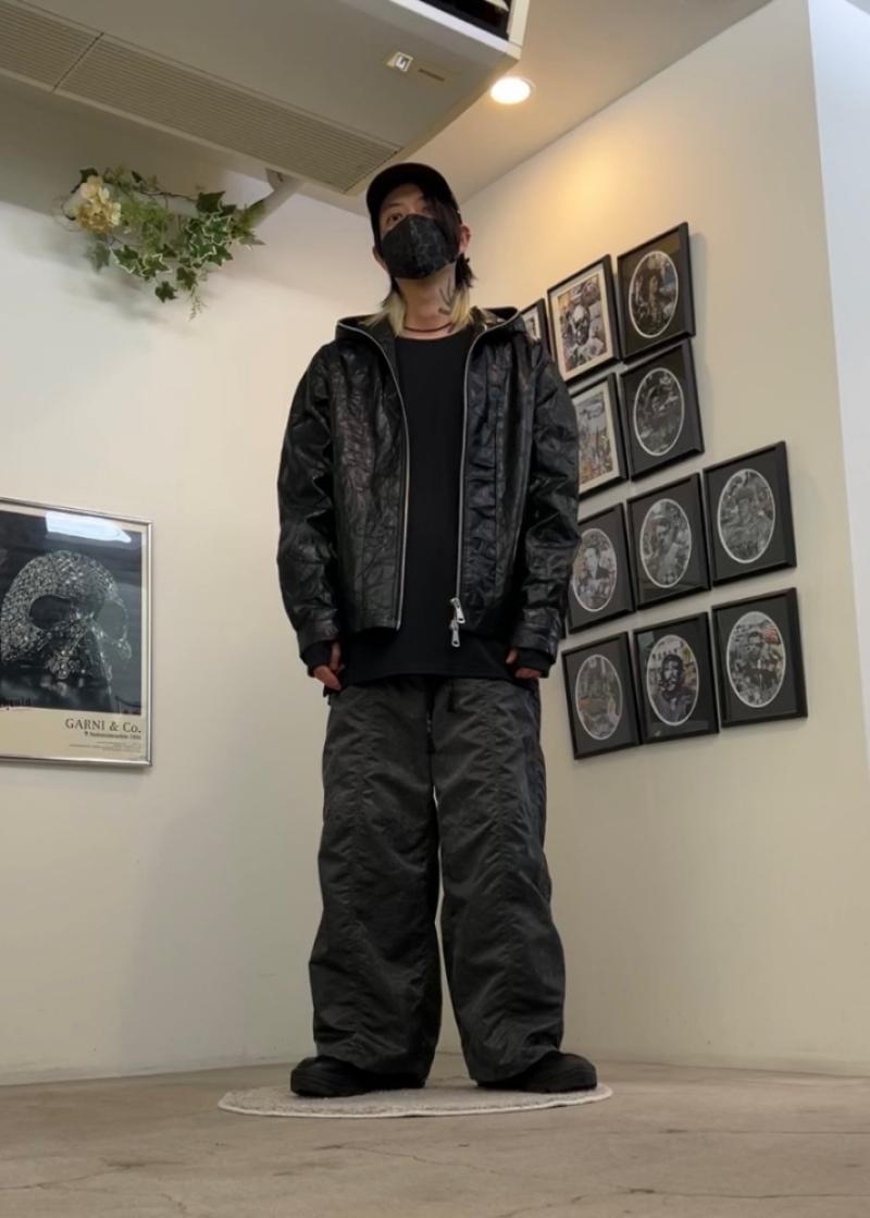 ・キックバックの強いリブ素材のサイドスリットロングカットソーにシワ加工を施したシンセティックワッシャーレザーのフーディーブルゾンを羽織で。ボトムスはナイロンツイルにピグメント加工を施したバギーパンツでAラインに。リモンタナイロンの6パネルキャップをアクセントに、足元は希少なホースフロントを使用したサイドジップブーツ。 -