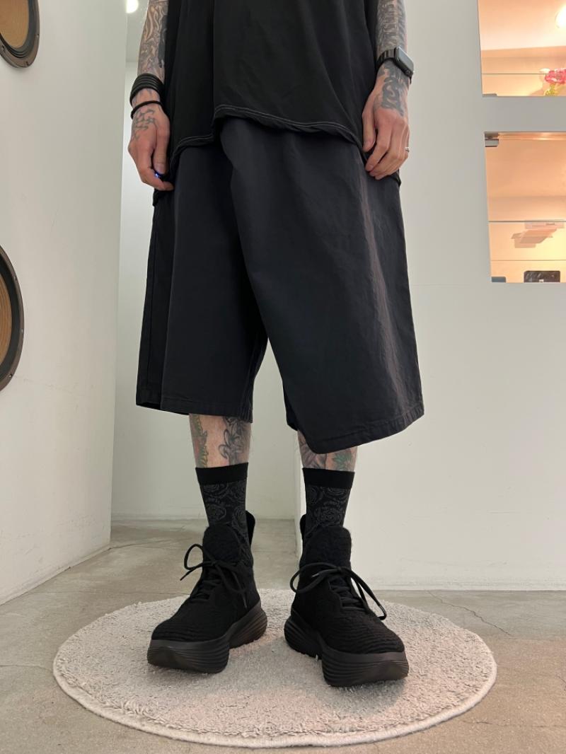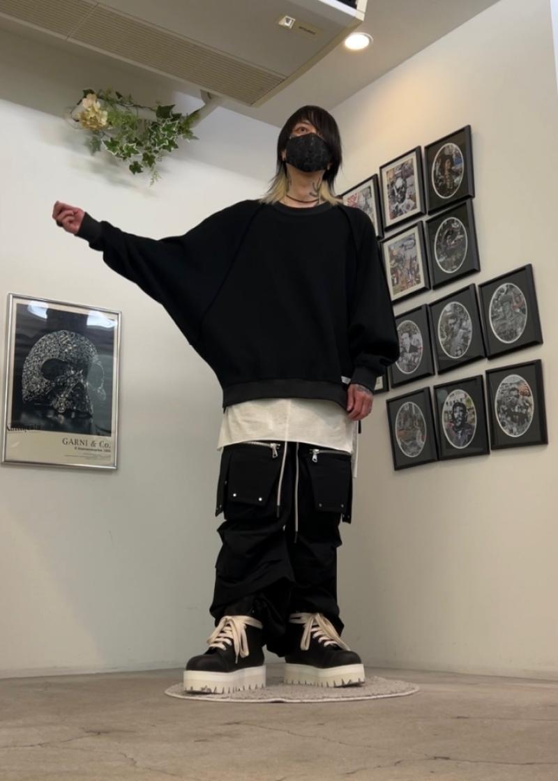 ・コットンニット素材のドルマンスリーブクルーネックにシラー感あるコットン×ナイロンの混紡素材ロングタンクトップをレイヤード。ボトムスはストレッチナイロン素材のカーゴタックワイドパンツの股の太さを絞り調整。足元はジャパニーズソフトゴートレザーを使用した8ホールスニーカーブーツで重量感をプラス。